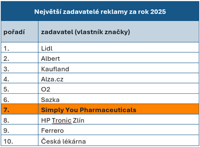 (Praha 3. února 2026) – Výzkumná agentura Nielsen Admosphere zveřejnila přehled největších zadavatelů reklamy v České republice za rok 2025. Simply You Pharmaceuticals a.s. se v celkovém pořadí umístila na 7. místě s objemem inzerce v ceníkových cenách ve výši 2,1 miliardy korun (oproti 2,4 miliardy korun v roce 2024).
